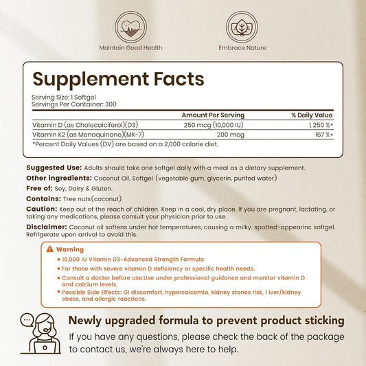 VEV Corefeel Vitamin D3 K2 10,000 IU, 200 mcg MK-7, 300 Coconut Oil Softgels, 2 in 1 Vitamins Supplement D & K (Include MK7), Easy to Swallow, Supports Calcium Absorption, Bone Health